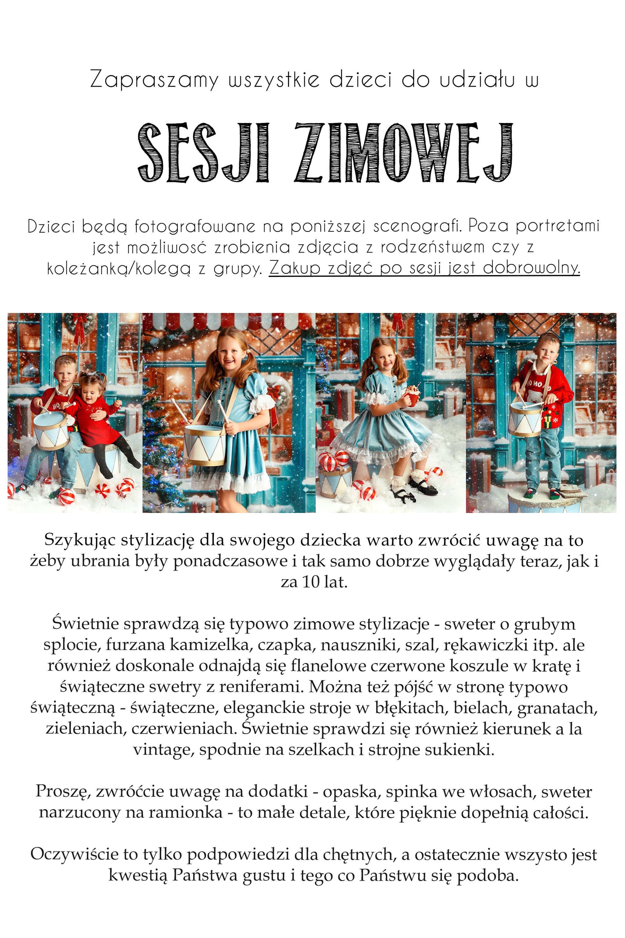 informujemy, że w dniach 18–21 listopada w naszym żłobku odbędzie się zimowa sesja zdjęciowa w poszczególnych grupach: